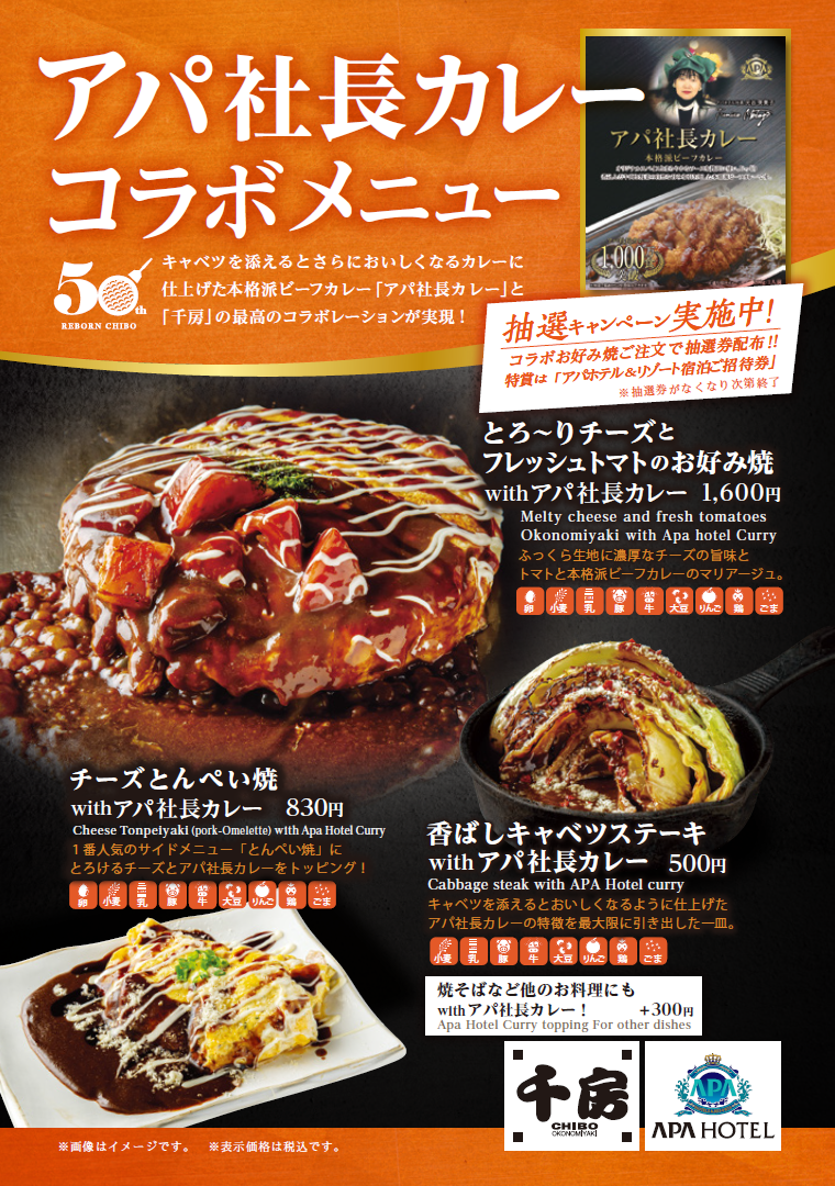 店舗でコラボお好み焼「とろ~りチーズとフレッシュトマトのお好み焼 withアパ社長カレー」をご注文の方に抽選券を進呈。