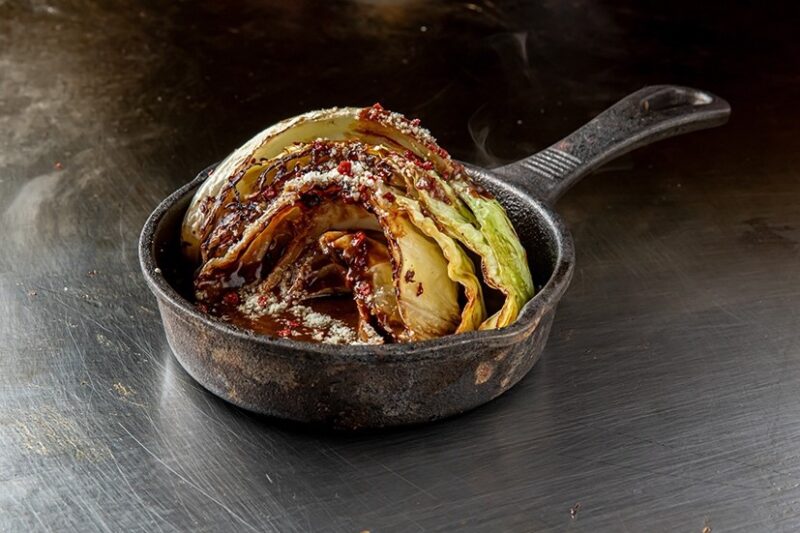 じっくりキャベツの甘味を引き出しながら焼き上げたキャベツステーキにアパ社長カレーをトッピング。キャベツを添えるとおいしくなるように仕上げたアパ社長カレーの特徴を最大限に引き出した一皿です。