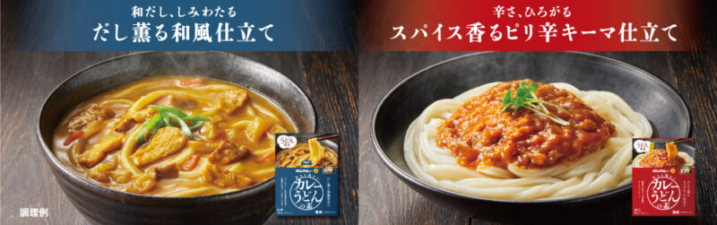 このたびの新製品は、箱ごとレンジで温め、うどんにかけるだけでおいしく簡単にカレーうどんが出来上がります。また、食べたい気分に合わせて楽しめるよう、汁ありと汁なしタイプをご用意しました。汁ありタイプの「だし薫る和風仕立て」は、かつおぶし、北海道産真昆布、長崎県産煮干しの和だしの旨みが特長です。汁なしタイプの「スパイス香るピリ辛キーマ仕立て」は、粗挽き唐辛子、黒胡椒の辛さがアクセントになっています。