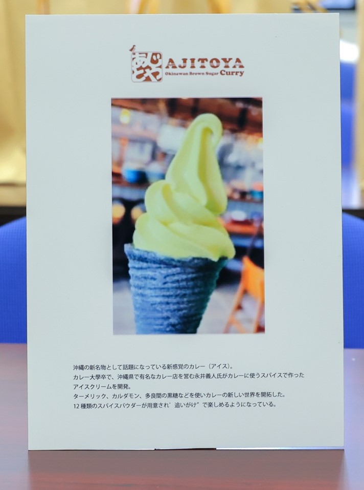 カレー大學卒で、沖縄で有名なカレー店を営む「永井 義人氏」が、カレーに使用するスパイスで作った新感覚のアイスクリームを開発。ターメリックやカルダモン、多良間の黒糖などを使い、カレー関連商品として新しいジャンルを開拓した。