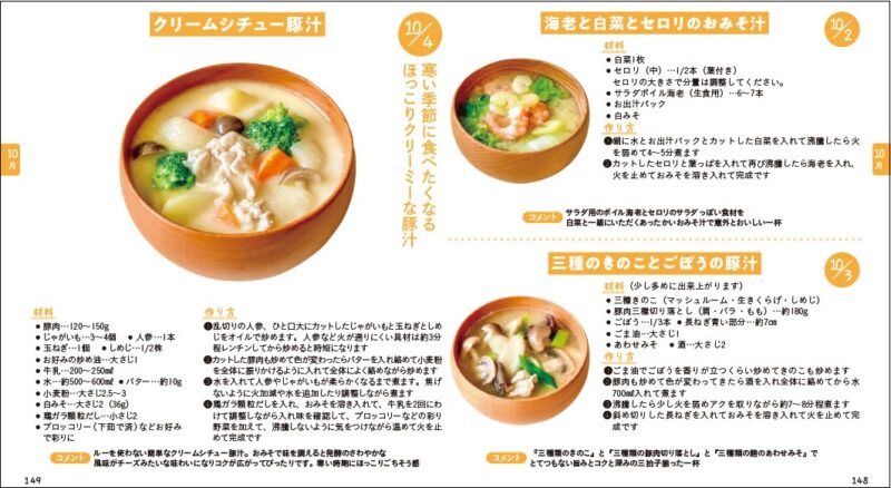 10月 サバ缶の具だくさんおみそ汁/もやしとキャベツの担々麺風おみそ汁/あおさとしらすのおみそ汁 ほか