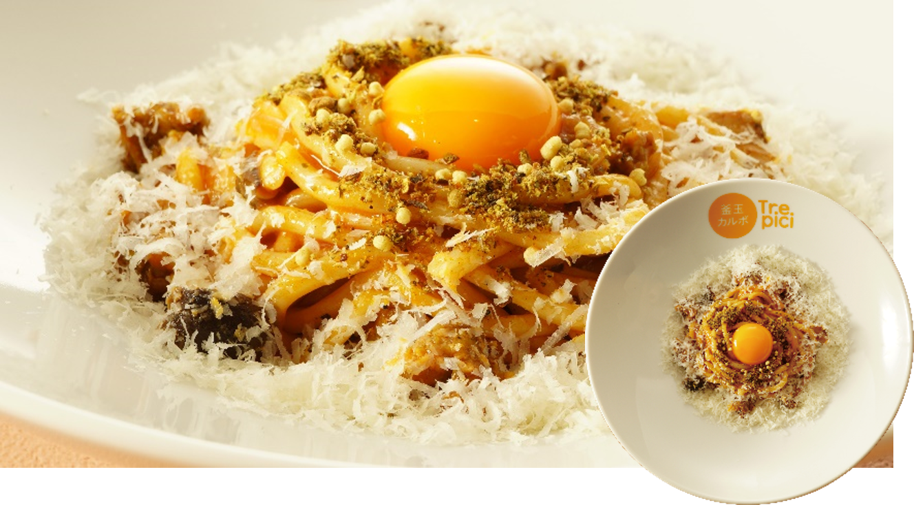 淡路島産デュラム小麦のセモリナ粉と北海道産小麦粉をブレンド。水だけで打ち上げた生地を丁寧に熟成し、直径3ミリの特注の切り刃でカットした極太麺です。また使用食材には、北坂たまごの「もみじ」や兵庫県産豚肉を用いており、ピチとの相性も抜群です。